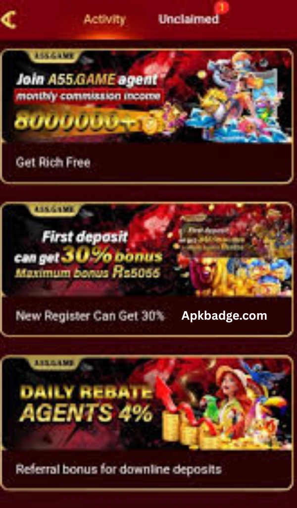 In A55Game, players can enjoy different styles of games. You can spin reels in Slots to win prizes, play Teen Patti with friends, or try your luck in Crash/Aviator, where you must cash out before the plane falls. The app also includes Rummy, Lucky Spin for surprise rewards, and Mines, where you pick safe spots while avoiding bombs. With so many options in one place, Salam Bet offers full entertainment and real money fun.