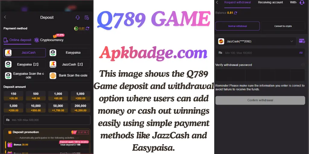 One of the best parts of the Q789 APK is that it gives real money rewards. Players can earn cash by winning games and withdraw it through JazzCash or Easypaisa easily.